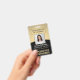**Please note that the background is printed to look metallic, but the product is not made of metal and is not foil.** Represent your business in style by supplying staff with with modern and professional identification badges. The Logo, photo, bar code and all wording on this template are all simple to customize. The black and gold design features a faux metallic background with an elegant curved arc, your company logo, one square picture, employee name and title, and UPC / barcode on back. It can provide organization and security for company staff, while presenting the corporate branding with a stylish classic appearance. Please note that gold is printed color, not metallic foil.