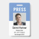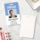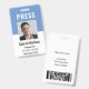 Personalize these vertical press pass badges with an employee photo and name, along with three lines of additional custom text for title or role, media outlet, and valid through date. PRESS appears at the top in bold white lettering. Additional custom text field located on the back for return information or other details, as well as a template for a barcode or a QR code.