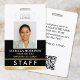Create a professional appearance with this personalized staff identification badge. A simple and stylish template with your ID photo, name, job title, employee number, company logo, and scannable QR code. All the text can be customized or deleted to suit your business needs. This elegant design would suit many different workplaces and professions, including retail salespersons, restaurant and foodservice employees, office staff, small businesses, conference name tags and more! Printed colors: black and white with a gold gradient.