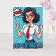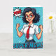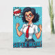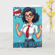This Mother's Day card features an empowered woman shown from the waist up, centered in front of a bright blue background that radiates outward like a burst of energy 👩. Her dark, wavy hair frames an expressive face, with red-rimmed glasses drawing attention to her turquoise eyes and a small, confident smile that feels like she’s cheering someone on ❤️. She wears a white collared shirt with a red tie, matching round red earrings, and dark trousers, and her bent arms and raised fists give her a heroic, ready-to-take-on-anything pose. The setting stays graphic and comic-inspired, with scattered small white circles floating around her like glowing sparks. In the upper left, a jagged white speech bubble holds the word “POW!” in red letters. Near the bottom, the phrase “SUPER MOM!” appears in large, chunky lettering with a dimensional look, standing out clearly against the blue. The palette is dominated by strong blues, reds, and crisp whites, with thick outlines and radiating lines filling the background behind her.