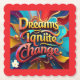 A vibrant design featuring the text "Dreams Ignite Change" in a dazzling array of colors, accented with golden touches that shimmer like stars. The bold typography is surrounded by abstract shapes and swirling patterns, symbolizing the energy and potential of creativity. This piece inspires viewers to embrace their aspirations and transform them into reality."Original Image was generated by Meta AI. AI generated artwork. Licensed under CC BY-SA 4.0.