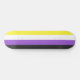 This design features the non-binary pride flag, which represents people who identify as non-binary (also spelled nonbinary) or genderqueer, involving a spectrum of gender identities that are not exclusively masculine or feminine, but are outside the gender binary. Non-binary identities can fall under the transgender umbrella, since many non-binary people identify with a gender that is different from their biology. An informal term for non-binary is "enby", which comes from the abbreviation NB. Non-binary people may identify as having two or more genders, having no gender, moving between genders, having a fluctuating gender identity and being third gender or other-gendered.