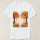 Trees with flaming orange, red, and gold leaves, leaves drifting in spirals, glowing mushrooms at roots, small woodland creatures with sparkling fur.