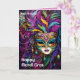 💚💜💛The card features a stunning close-up of a Mardi Gras performance artist, captivating with their entrancing presence. Their visage is adorned with intricate and beautiful makeup, a mesmerizing fusion of deep purples, vibrant turquoise, and shimmering golds, creating a spellbinding allure. The makeup highlights their eyes, adding an ethereal quality to their appearance.