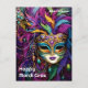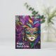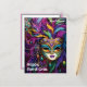 💚💜💛The postcard features a stunning close-up of a Mardi Gras performance artist, captivating with their entrancing presence. Their visage is adorned with intricate and beautiful makeup, a mesmerizing fusion of deep purples, vibrant turquoise, and shimmering golds, creating a spellbinding allure. The makeup highlights their eyes, adding an ethereal quality to their appearance.