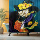 A striking surreal illustration of an elegant Asian witch adorned with golden autumn flowers, swirling leaves, and glowing magical accents, tenderly holding a chihuahua familiar. Rich jewel tones, deep shadows, and luminous details create a mysterious, modern fantasy atmosphere with a touch of Halloween elegance. Perfect for anyone drawn to enchanting art with a whimsical animal companion.