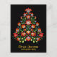The front of the postcard features a stunning holiday scene. Against a deep, velvety black background, a majestic Christmas tree takes center stage. The tree is not composed of traditional evergreen branches, but rather a vibrant array of meticulously crafted folklore-inspired flowers. These flowers, in shades of rich red, dark yellow, delicate lavender, soft peach, and muted slate blue, interlace seamlessly to form the shape of the tree.