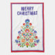 Introducing a charming kitchen towel featuring a mesmerizing holiday scene inspired by Poland's beloved "Wycinanki" tradition. Against a pristine white backdrop, a resplendent Christmas tree steals the spotlight, adorned with meticulously crafted folklore-inspired flowers in rich red, dark yellow, delicate lavender, soft peach, and muted slate blue. The cut-out style imparts a whimsical touch, with intricate detailing on each petal and leaf, adding depth and texture to the scene.