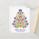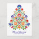 On the front of this postcard unfolds a breathtaking holiday tableau set against a pristine white backdrop. Commanding attention is a regal Christmas tree, standing proudly amid the snowy canvas. This tree, however, diverges from convention as it is adorned not with evergreen boughs but with a brilliant array of meticulously crafted folklore-inspired flowers, echoing the traditional Polish art form known as "wycinanki."
