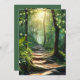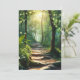 Enchanted forest Save the Date card featuring a sunlit path in a forest with sparkling fairy lights. On the back is space for your custom photo. This card is intended as part of a set with vellum overlay.