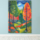 A vibrant linocut print in a folk art style inspired by Marc Chagall, depicting a whimsical forest scene. Fantastical trees, vibrant colors, and playful details evoke a sense of magic and wonder.