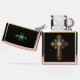 A wooden cross adorned with shimmering green stones stands amidst a natural setting, exuding a sense of magic and enchantment.