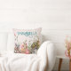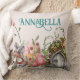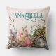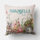 This magical and whimsical throw pillow features an enchanted forest theme. An image of a fairy door in a little mushroom garden is placed at the bottom, with a fairy fluttering above it. Various flowers and mushrooms are placed along the bottom. The background is a faded pink pattern.