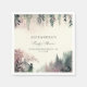 A whimsical watercolor illustration of lush foliage in emerald green and mauve and purple, sparkling bright with fairy lights and magic dust, with the mountains in the background and an adorable little fairy hidden in the greenery, decorates this girl baby shower napkin with an enchanted forest theme. An elegant, modern personalized napkin for a fairytale baby shower. Perfect for moms to be who love the fairytale forest setting, the fairy forest or fairy garden theme and emerald green, mauve and gold.
