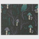 A mysterious woodland-themed Halloween design with watchful owls, sleek black cats, glowing mushrooms, and barren trees under a starlit night. The deep teal, purple, and ivory palette adds an enchanting and slightly eerie vibe, making it ideal for magical wrapping paper, textiles, or decorative prints.