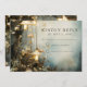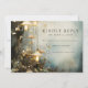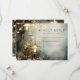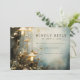 Ethereal forest mist and trees with hanging mushroom shaped lanterns featured in this wedding save the date announcement, in deep blue gray forest hues, and mist. Ethereal and mystical.