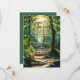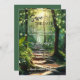 Enchanted forest Save the Date card featuring a sunlit path in a forest with sparkling fairy lights. On the back is space for your custom photo.