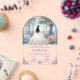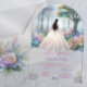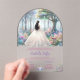 Celebrate her magical day with this Enchanted Garden Quinceañera invitation, beautifully printed on a clear acrylic arch card. The design showcases a stunning young woman in a shimmering white gown with long flowing hair, standing in a dreamy fairytale forest filled with glowing pastel flowers, fantasy mushrooms, and twinkling sparkles. This elegant and ethereal setting creates a breathtaking first impression for any quince años event.