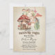 This custom invitation features and enchanted garden baby shower theme. The background is a faded parchment paper design to resemble an vintage fairytale book. An image of a little mushroom house and pathway leading to an enchanted fairy garden is pictured in the top portion. Various flowers and mushrooms are placed along the pathway. Delicate fairy lights accent the top and bottom portions.