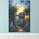 Step into a dreamy twilight world with this enchanting design featuring a rustic wooden garden gate, softly illuminated by a glowing lantern and surrounded by lush foliage and blooming foxgloves. Tiny fireflies dance through the dusky air, creating a magical, fairytale atmosphere that feels both nostalgic and otherworldly. The painterly style and rich color palette of midnight blues, soft golds, and violet tones invite you to imagine secret paths and quiet moments under the stars. Perfect for bringing a touch of woodland wonder to any space, this piece evokes the charm of moonlit gardens and summer nights. AI generated artwork.