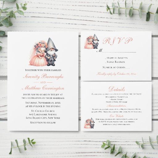 Invite guests to your fairy tale wedding with this whimsical gnome wedding invitation! With a cute watercolor gnome bride and groom, this woodland-inspired design is perfect for a cottagecore, boho, or enchanted forest wedding. The coral orange and gray color palette add a warm, rustic charm, making it ideal for a spring or summer celebration. Whether your planning a storybook, fantasy, or rustic nature wedding, this charming invitation sets the perfect tone for a magical and unforgettable day!