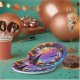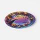 This vibrant Halloween-themed illustration features a central scene with carved pumpkins displaying various expressions, a witch’s hat, and ghosts. Surrounding this are more pumpkins, autumn leaves, spiders, spider webs, and bats against a backdrop that transitions from purple to orange, suggesting a sunset or twilight setting. Perfect for adding a touch of Halloween magic to any setting, these paper plates are ideal for parties and celebrations.