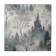 This fantastical scene ceramic tile features a dark, towering castle with glowing windows nestled in a misty forest of blue and grey tones. Surrounded by slender evergreens, bare-branched trees, and soft blossoms in pink and orange, the landscape shimmers with subtle specks of magical light. The twilight ambiance and ethereal details create a whimsical, mysterious atmosphere, perfect for lovers of fantasy, fairytales, and dreamlike forest settings.