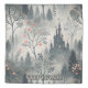 This fantastical scene duvet cover features a dark, towering castle with glowing windows nestled in a misty forest of blue and grey tones. Surrounded by slender evergreens, bare-branched trees, and soft blossoms in pink and orange, the landscape shimmers with subtle specks of magical light. The twilight ambiance and ethereal details create a whimsical, mysterious atmosphere, perfect for lovers of fantasy, fairytales, and dreamlike forest settings.