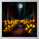 A serene evening forest path houses glowing flowers under the moonlight, creating an enchanting atmosphere full of tranquility and magic.