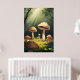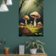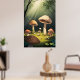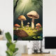A whimsical illustration depicts a cluster of mushrooms in a sun-dappled forest. The largest mushroom, with a white cap dotted with brown spots, stands tall in the center, its stem casting a long shadow.