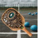 A pickleball paddle adorned with a mesmerizing green eye, a unique and mystical design that catches the eye.
