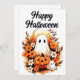 This charming Halloween illustration radiates playful warmth and seasonal cheer. A friendly ghost peeks out from behind a smiling jack-o’-lantern, surrounded by a lush bouquet of autumn leaves and blooming orange and white florals. A second ghost floats nearby, adding soft whimsy to the composition. The “Happy Halloween” script at the top—rendered in flowing black cursive—offers an elegant touch that balances the design’s cozy rustic charm. Perfect for greeting cards, stickers, or party signage, this scene invites joy over fright with its gentle color palette and floral flair.