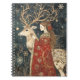 The artwork depicts an enchanting scene featuring a woman dressed in an ornate, crimson cloak adorned with golden patterns. Her long brown hair is elegantly styled, with floral and ribbon accents. She is gently touching a deer with intricate, branching antlers, decorated with ornaments. Snowflakes and starry patterns surround them, evoking a magical, wintery atmosphere. The artwork blends a mystical, fairytale-like charm with a holiday season ambiance, featuring a delicate, illustrative style.