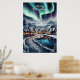 A scenic snowy village illuminated by vibrant aurora northern lights, creating a magical winter wonderland scene. Christmas poster