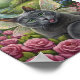Adorable gray fairy cat with iridescent wings lounging amid pink roses in an enchanted garden with a waterfall and mossy arched stone doorway.