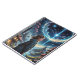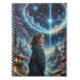 This fantastical scene captures a cloaked figure standing at the edge of a mystical landscape, gazing up at an enchanting night sky. Above, a large, glowing celestial object with a bright star at its center illuminates the scene, surrounded by swirling clouds and smaller stars. The whimsical, medieval-style buildings with pointed roofs and glowing windows set against mountains and a river create a mesmerizing, otherworldly atmosphere, making this piece perfect for lovers of fantasy art.