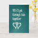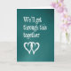 We'll Get Through This Together is the encouragement message on this card to show support for someone who has an illness or is going through a hard time or facing a challenge. Teal background with two hearts graphic. This is particularly appropriate for breast cancer patients or anyone recently diagnosed with a major illness. Inside text "I Love You" can be edited to your own specific message.