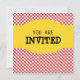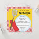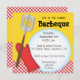 This brightly colored barbeque invitation has a yellow background with a strip of red checks across the bottom. A red oven mitt and a spatula graphic are on the left side with a big white circle opening for the text. This invite can be customize for any type of a barbeque or cookout.