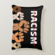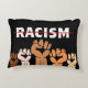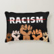 Social justice themed accent pillow features redlined RACISM text with multi shade raised fists of protest.