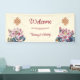 This Tibetan wedding reception board features a traditional endless knot and lotus flowers and a wedding welcome text in an elegant script on a modern cream background.