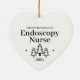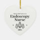 First Christmas as an endoscopy nurse heart ornament for a new job in nursing in the operating room. Elegant porcelain ceramic holiday ornaments in white with black lettering. Featuring Christmas trees and stars.