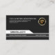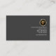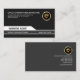 A simple design with the centerpiece at the base of the card being the main object of attention. Your name rest in a white trapezium. Right below is a grey rectangle which houses your job title and further down the line, your contact details. All this in a black elegant background. Directly above you have the business name and address with its faux gold icon logo beside it.