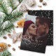 This modern minimalist photo our first Christmas engaged holiday card design features a full bleed photo on the front side overlaid with classic serif text mix script typography of the words 'Engaged and very Joyful', including the couple's names and holiday greetings