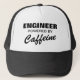 Engineer powered by caffeine trucker hat. Funny cap for coffee lover, addict, boss, co worker, husband, dad, brother, grandpa, employee, staff, personnel etc. Office humor for men and women on the job. Customizable quote for other occupations and professions. Custom headwear Birthday gift idea. Typography template design.