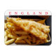 A close up photograph of Fish and Chips printed on a souvenir fridge magnet.