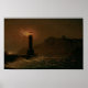 A great lighthouse burns fiercely against the dark of night, flames leaping into the sky and reflecting off the water below. Boats rush toward the blaze as figures on the shore watch in horror and awe. Smoke curls across the stars, and the ocean glows with the eerie light of disaster.