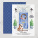 Announce your new address with our stylish announcement featuring a English Bulldog, blue front door, welcome mat, slate sign, topiaries and a floral wreath set on a gray brick background.