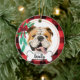 Bulldog ornament with red buffalo background and Christmas garland and bow - Art was hand painted by me and made available as this adorable ornament! Add any text (suggested: "I ❤️ my bulldog" or your sweeties name)