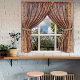 This gorgeous 'fake view' poster is as big as a real window and will help you feel like you are living in Tudor or Elizabethan Britain, or maybe in the time of Jane Austen. The semi-sheer drapes with their gold brocade design reveal a classic English scene beyond. A historic cottage is surrounded by leafy trees. This lovely summer scene was captured in Devon in the south of England. The curtains in the window have an ornate design and elegant ties, to add a sumptuous look to the scene.