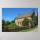 Poster print of an English honey-colored Cotswold stone cottage with a flower garden and a British flag in the Cotswolds, UK.